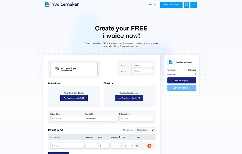 We’ve created the fastest way to invoice using an invoice template. You can create and download an invoice without creating an account. If you want to send an invoice, all you need to do is click one button and the e-invoice will be delivered to your customer.